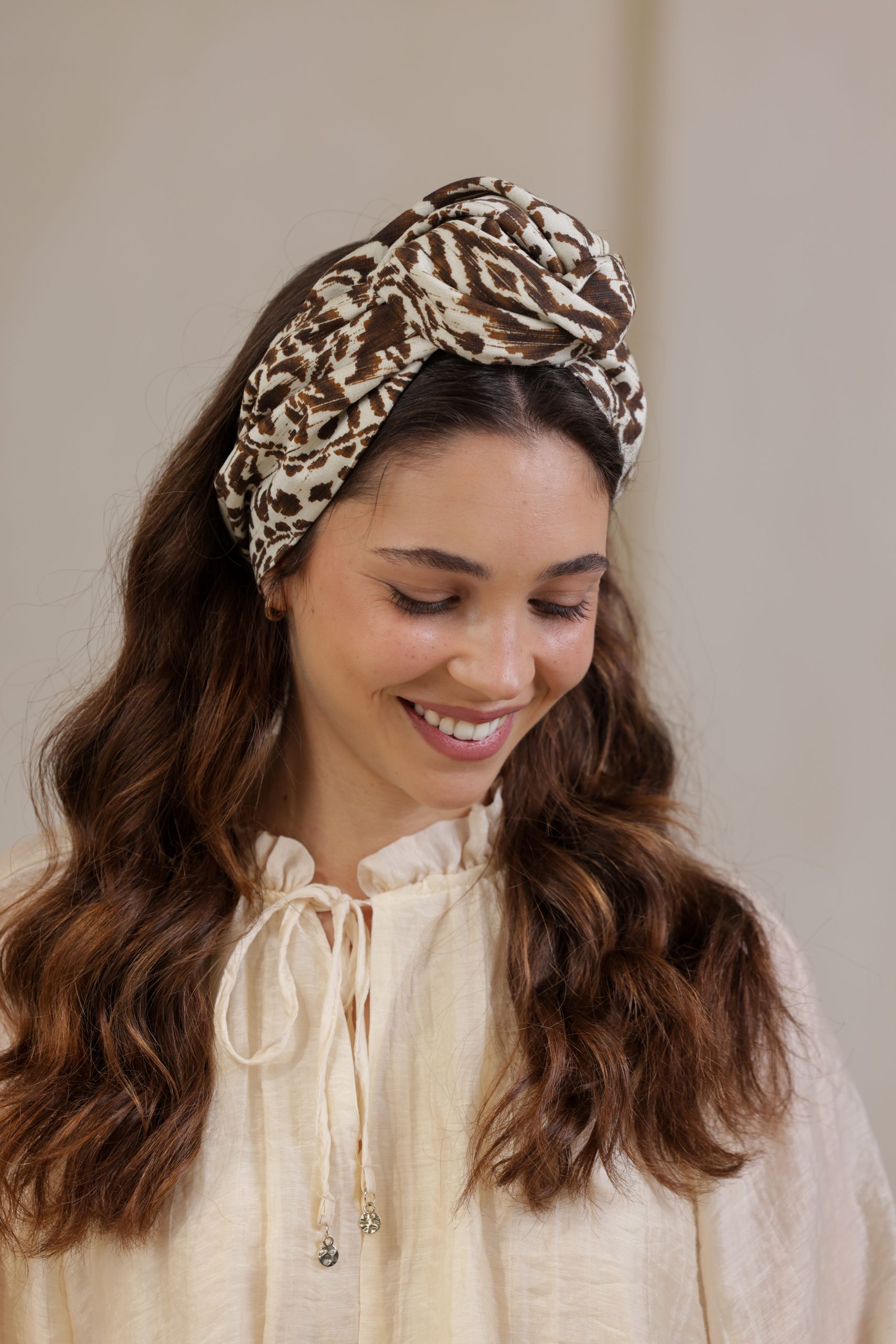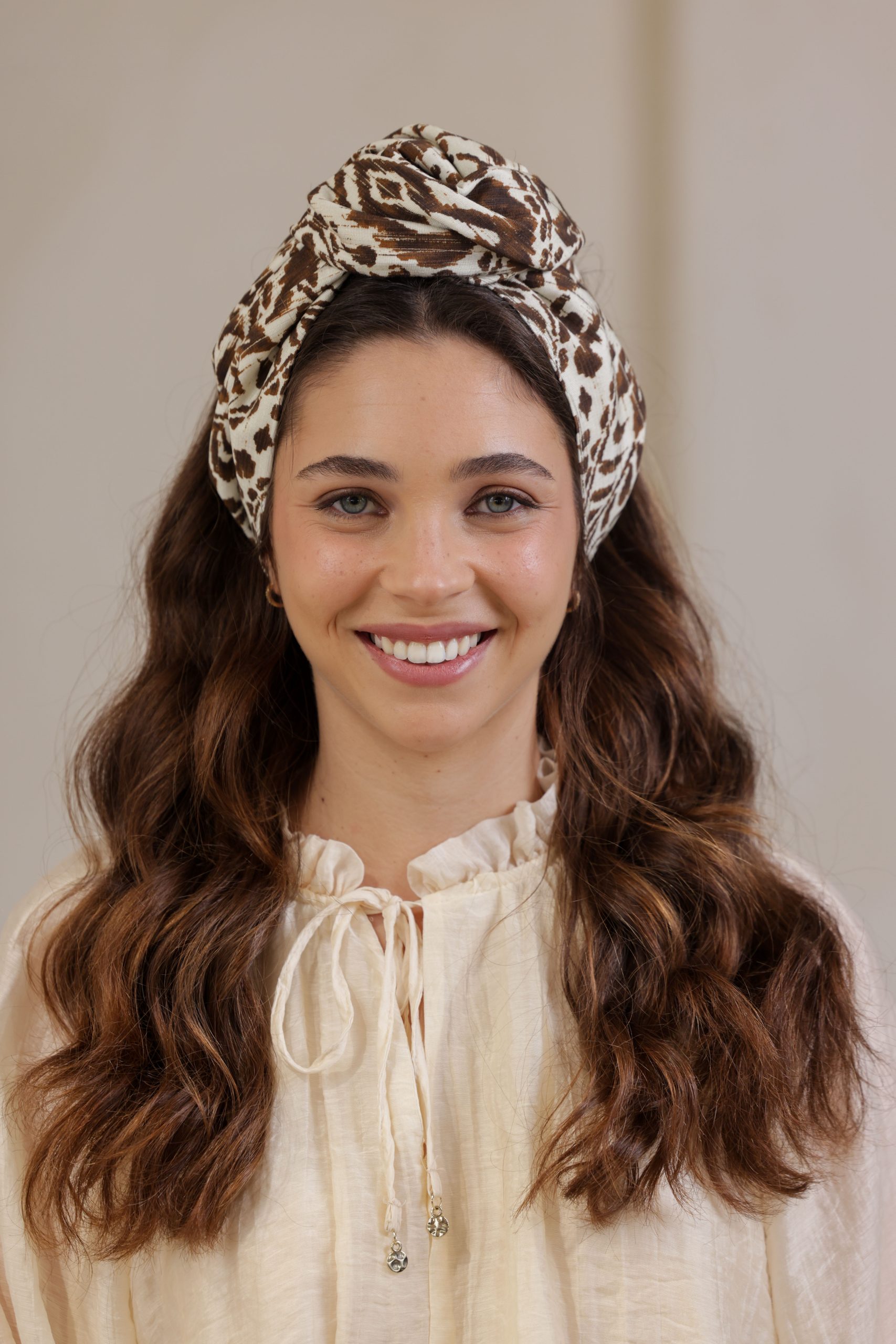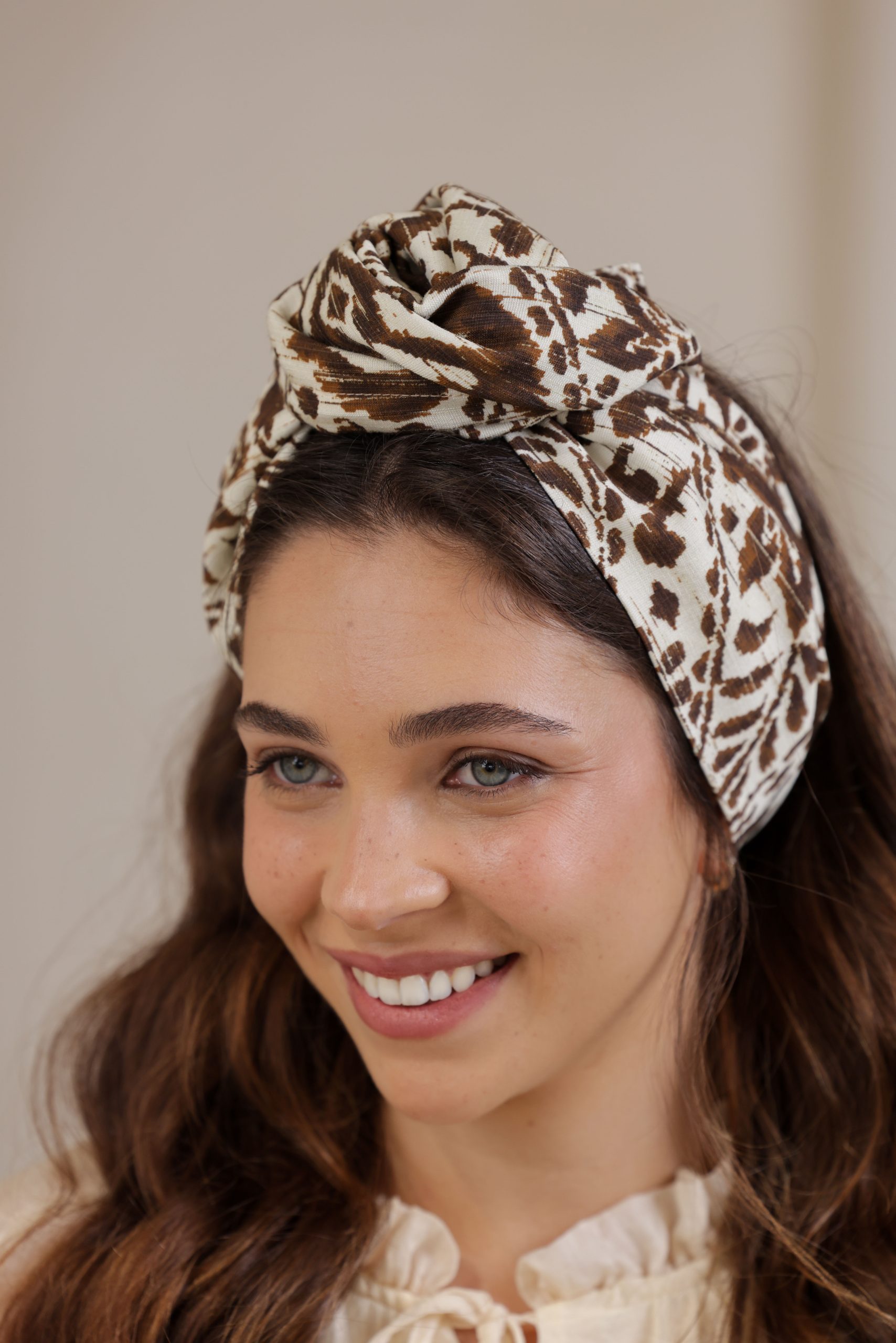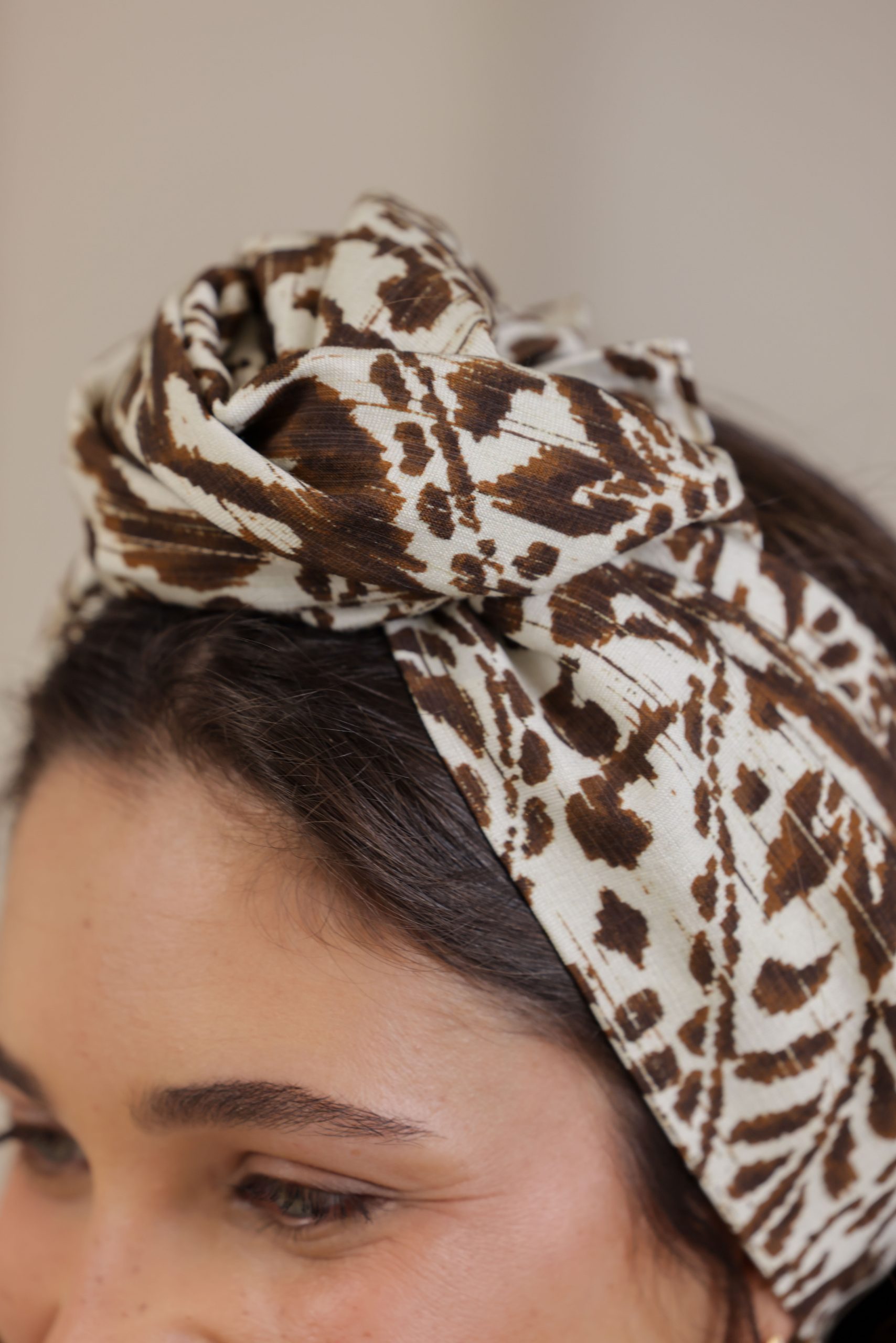 סרט לשיער עם חוט ברזל תפור בפנים ליצירת קשירות מגוונות ופשוטות, מבד כותנה איכותי עם הדפס יחודי בגווני חום לבן