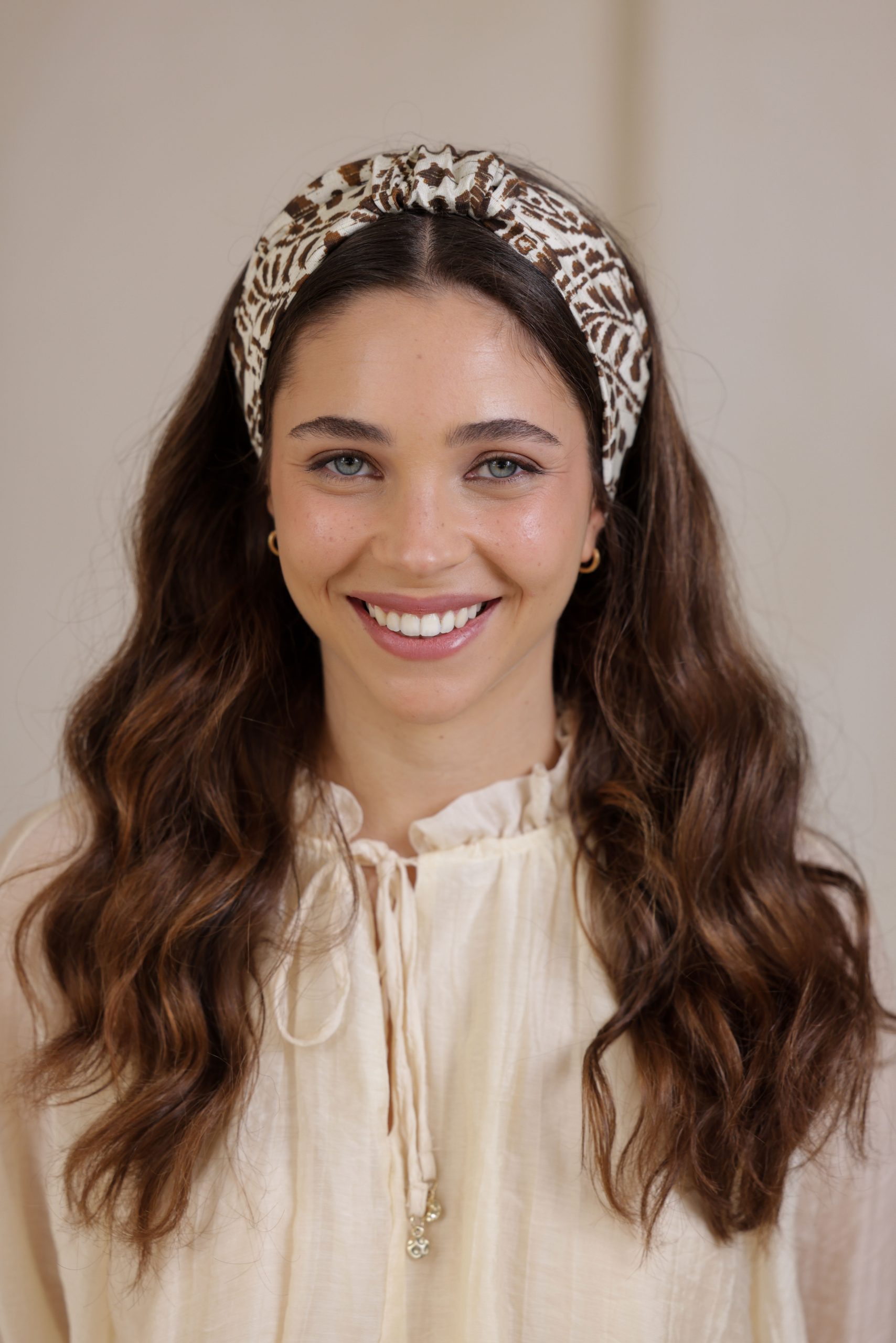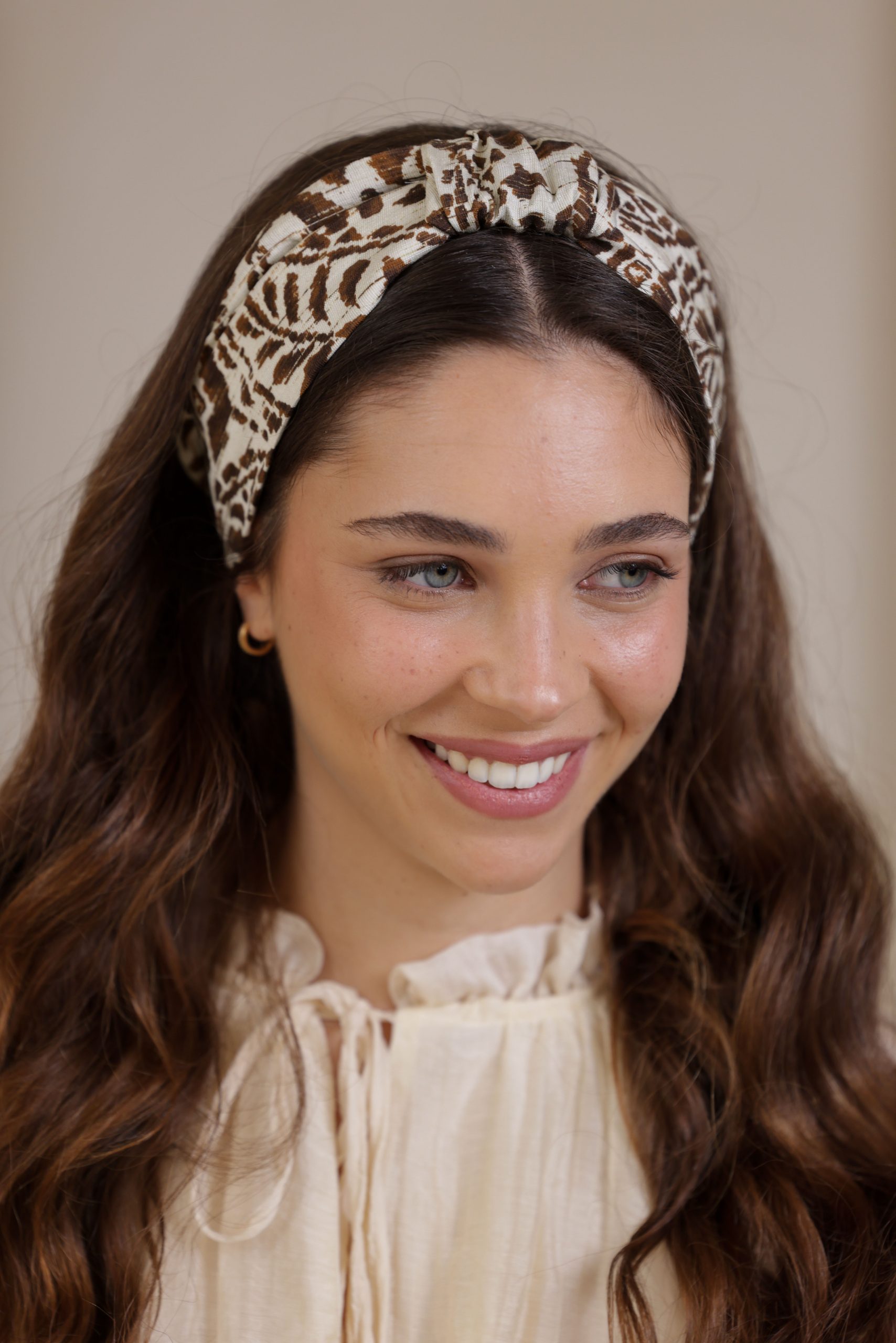 קשת לשיער עם חוט ברזל תפור בפנים, מבד כותנה איכותי עם הדפס יחודי בגווני חום לבן