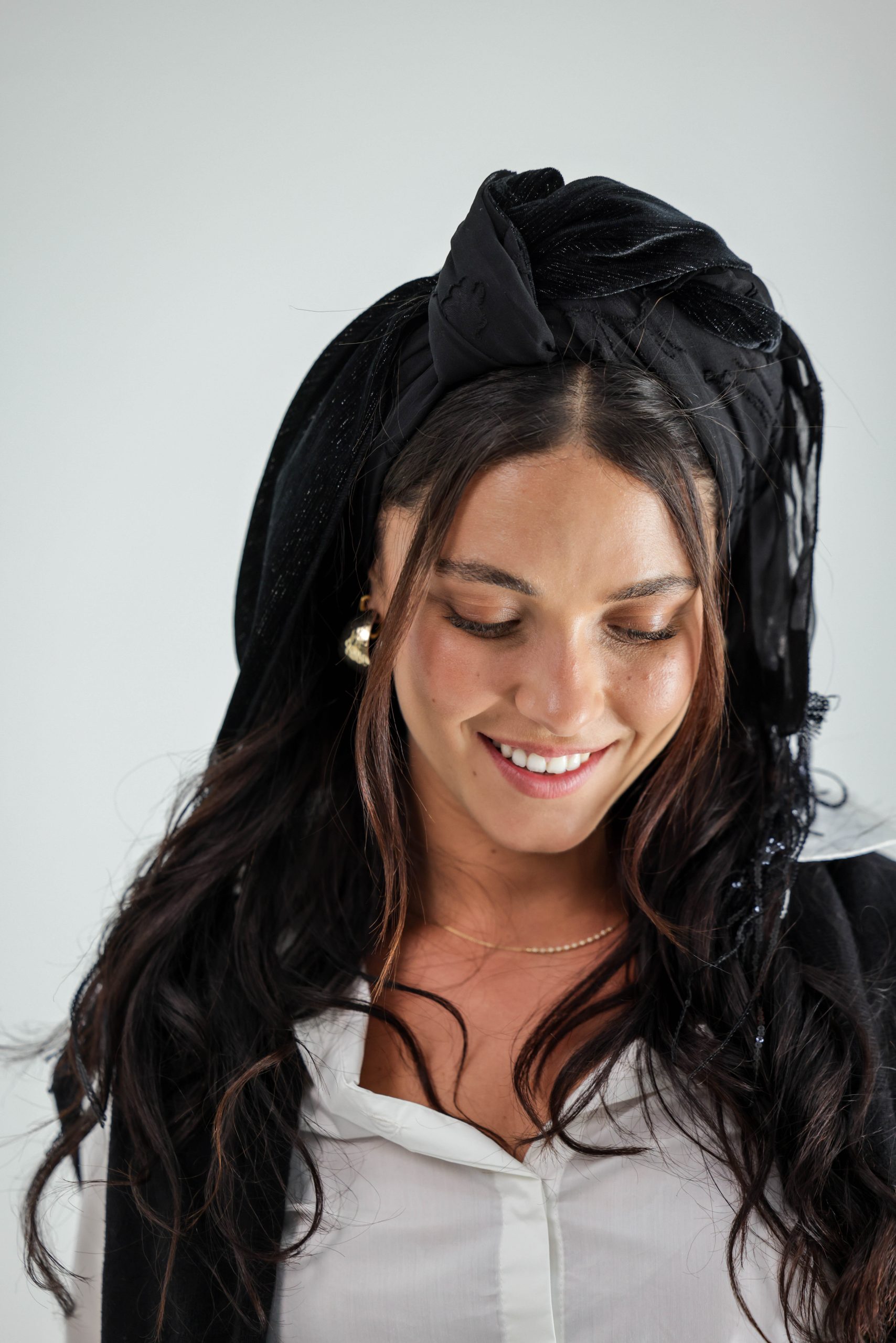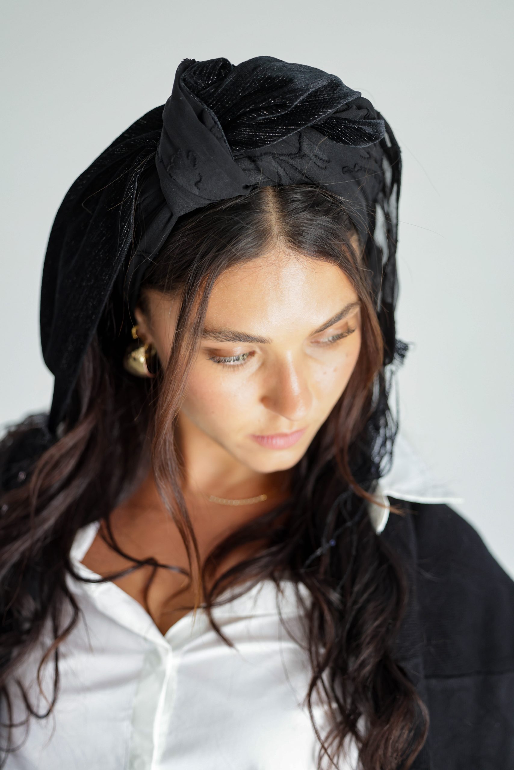 מטפחת לשיער עם חוט ברזל תפור בפנים ליצירת קשירות מגוונות ופשוטות, מבד שיפון בטקסטורת פרחים בצבע שחור ומהצד השני בד פליסה קטיפה בצבע שחור עם חוט צהב שזור.