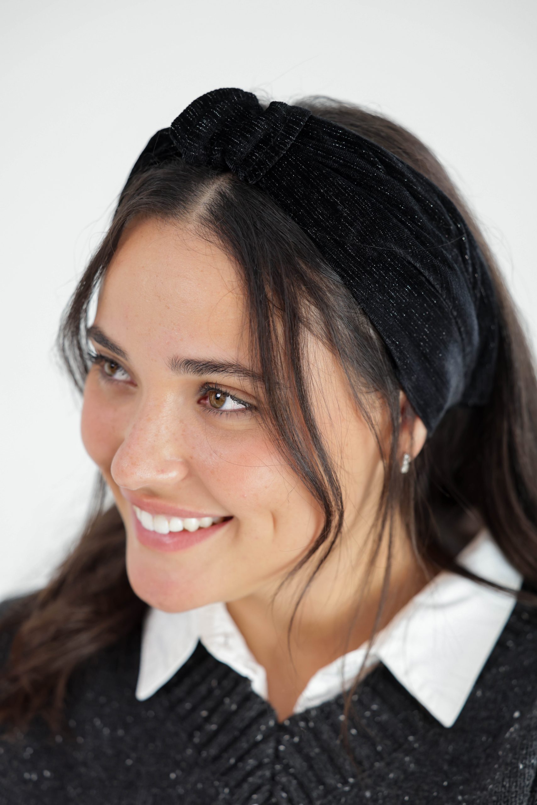 סרט לשיער עם חוט ברזל תפור בפנים ליצירת קשירות מגוונות ופשוטות,מבד פליסה קטיפה בצבע שחור עם חוטי זהב כסף שזורים בפנים.