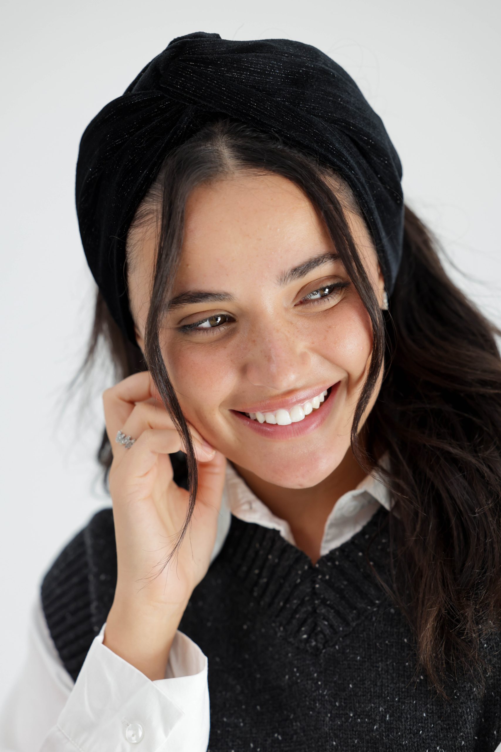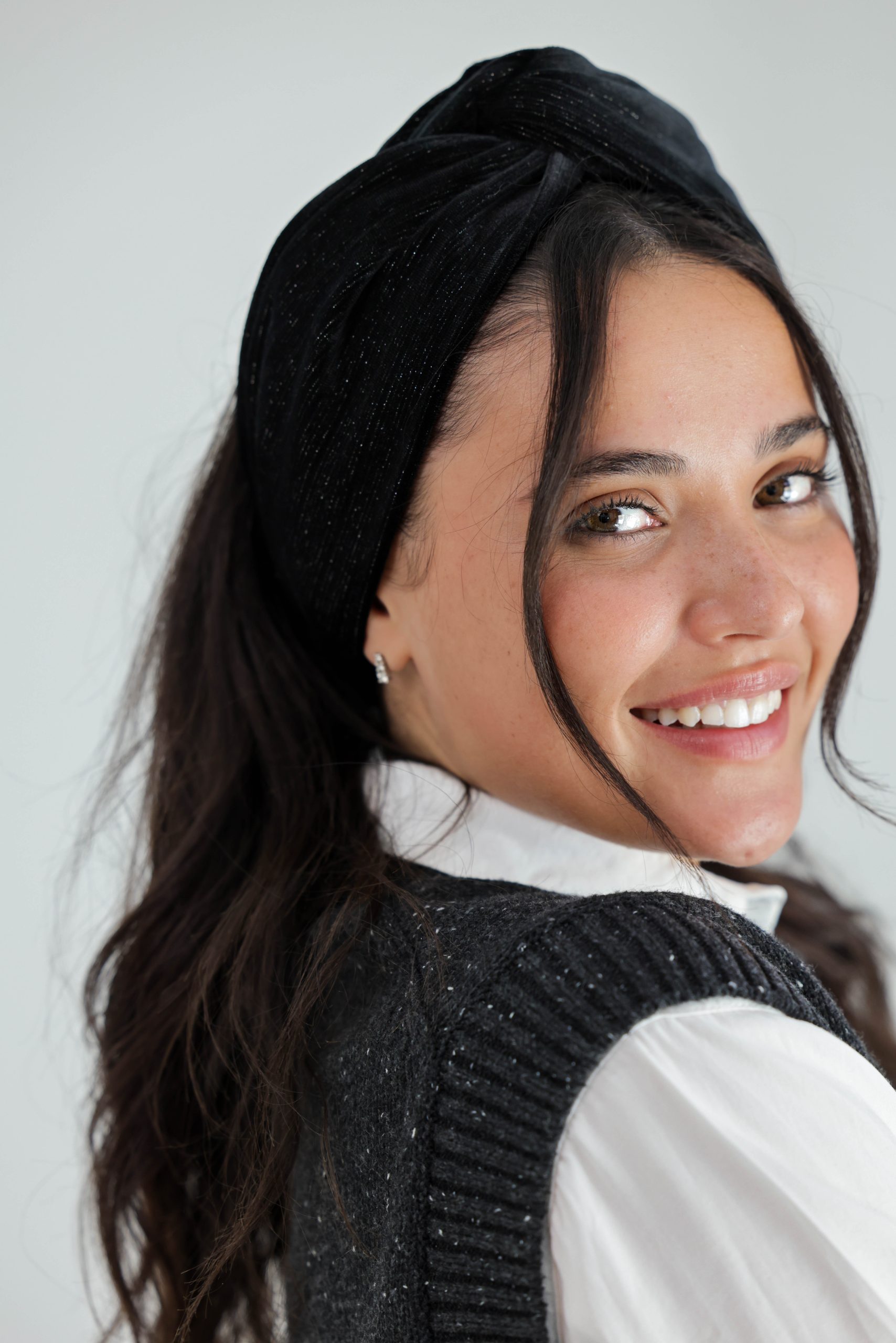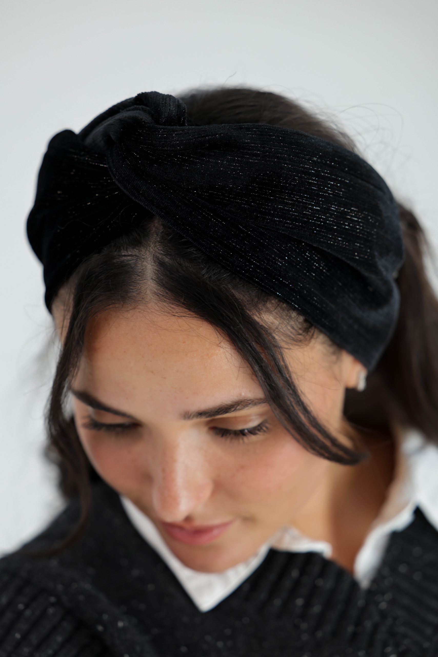 סרט לשיער עם חוט ברזל תפור בפנים ליצירת קשירות מגוונות ופשוטות, מבד פליסה קטיפה בצבע שחור עם חוטי זהב כסף שזורים בפנים.