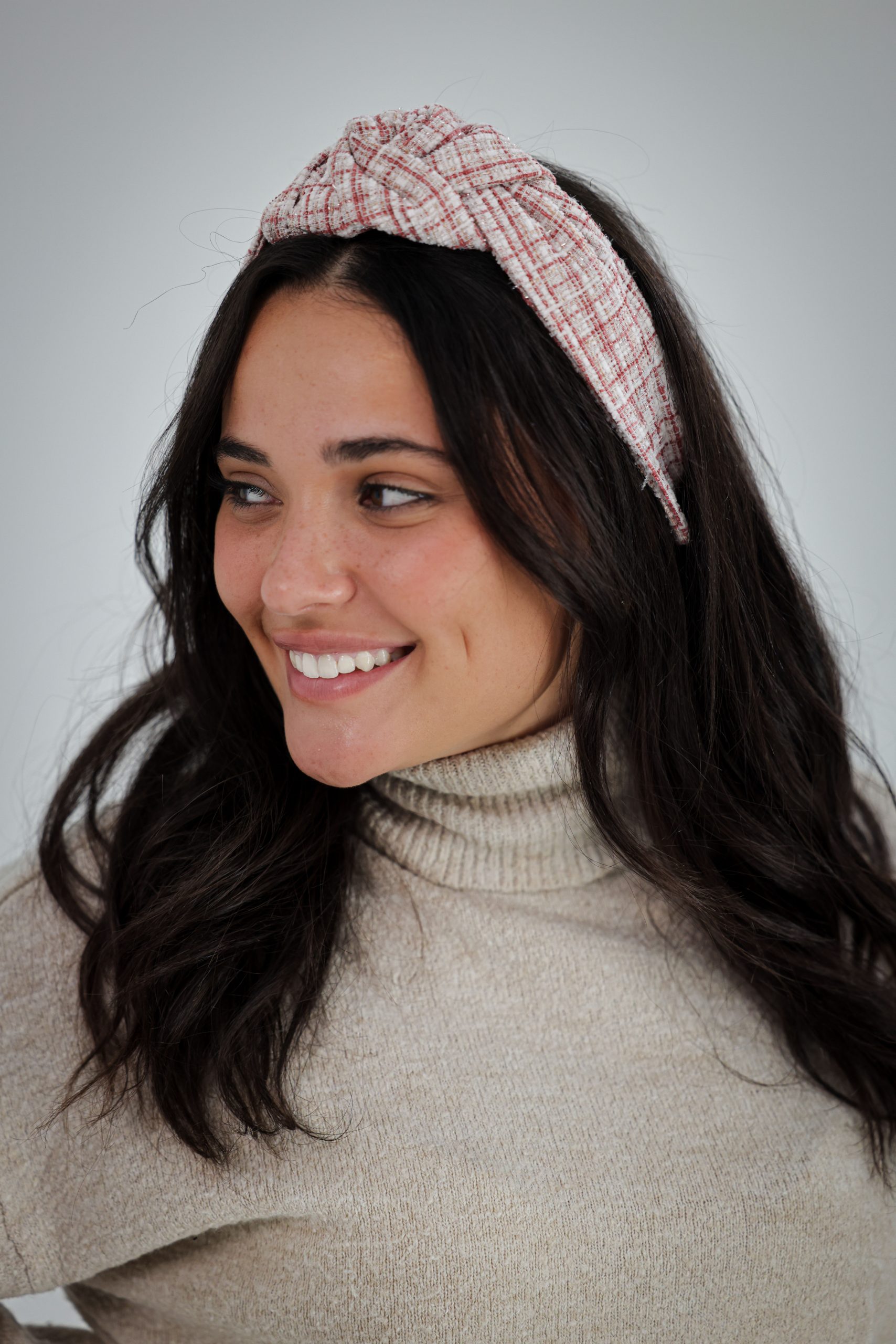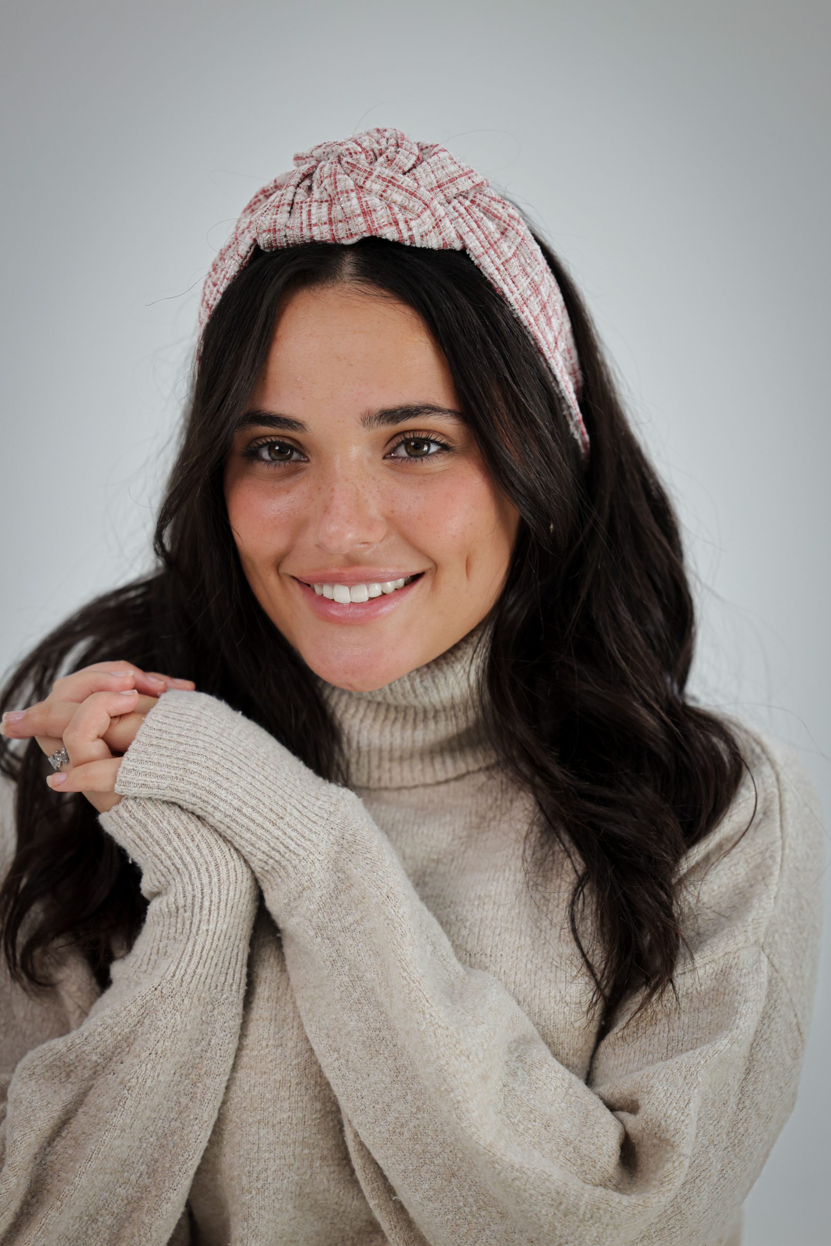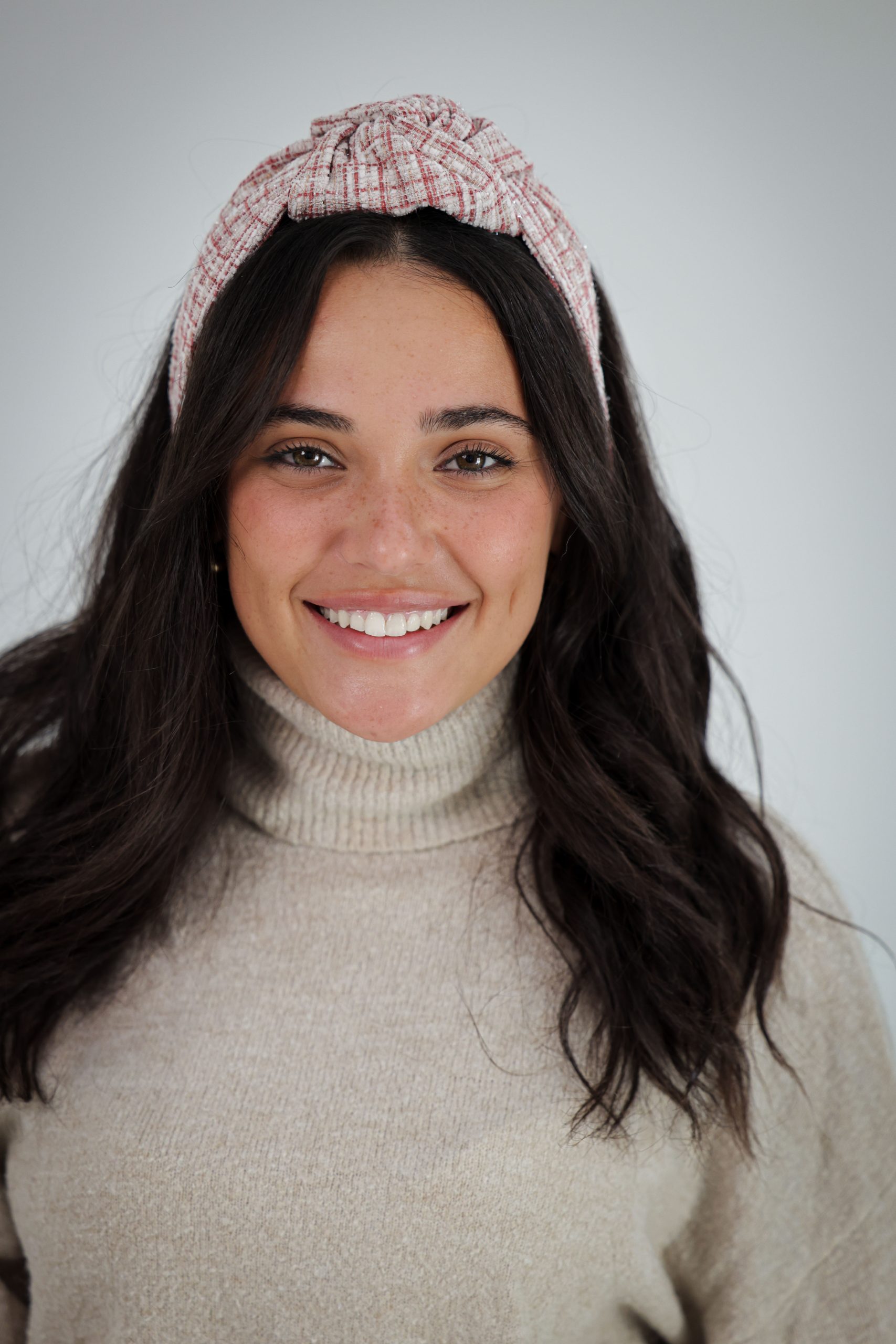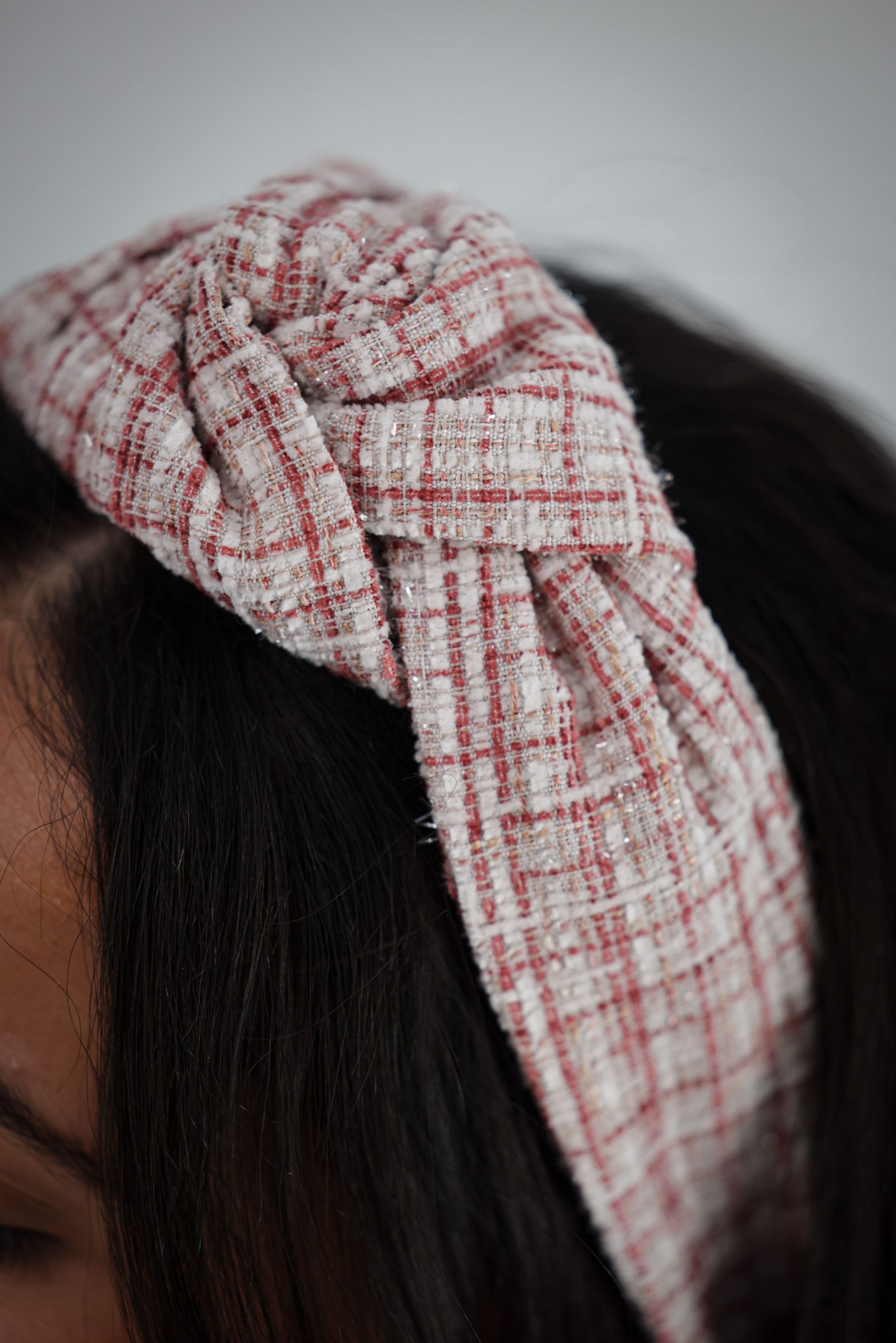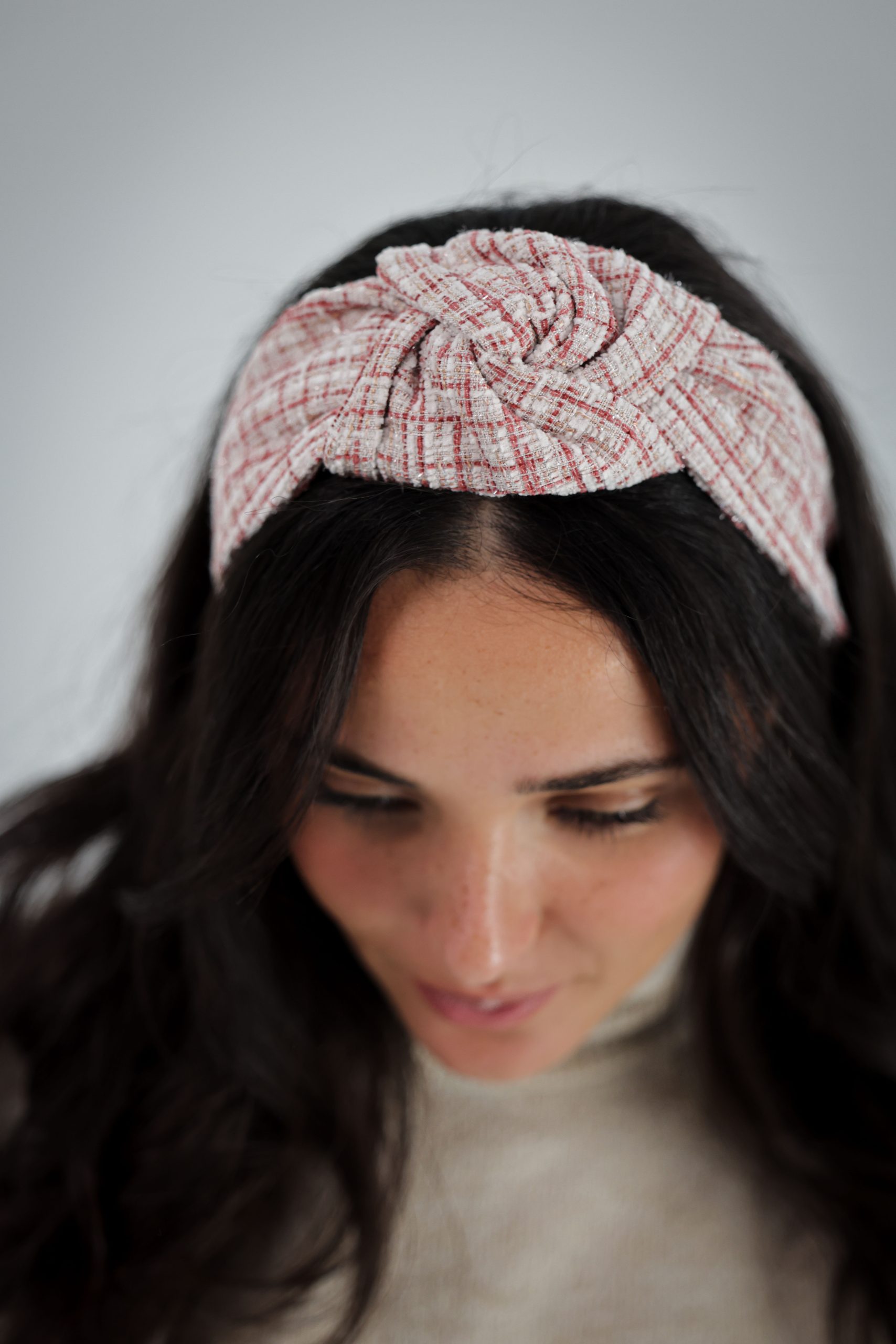 קשת לשיער עם חוט ברזל תפור בפנים ליצירת משחק עם הנפח והקשר שבמרכז הקשת. בד באריגת שתי ועבר בגווני ורוד לבן.