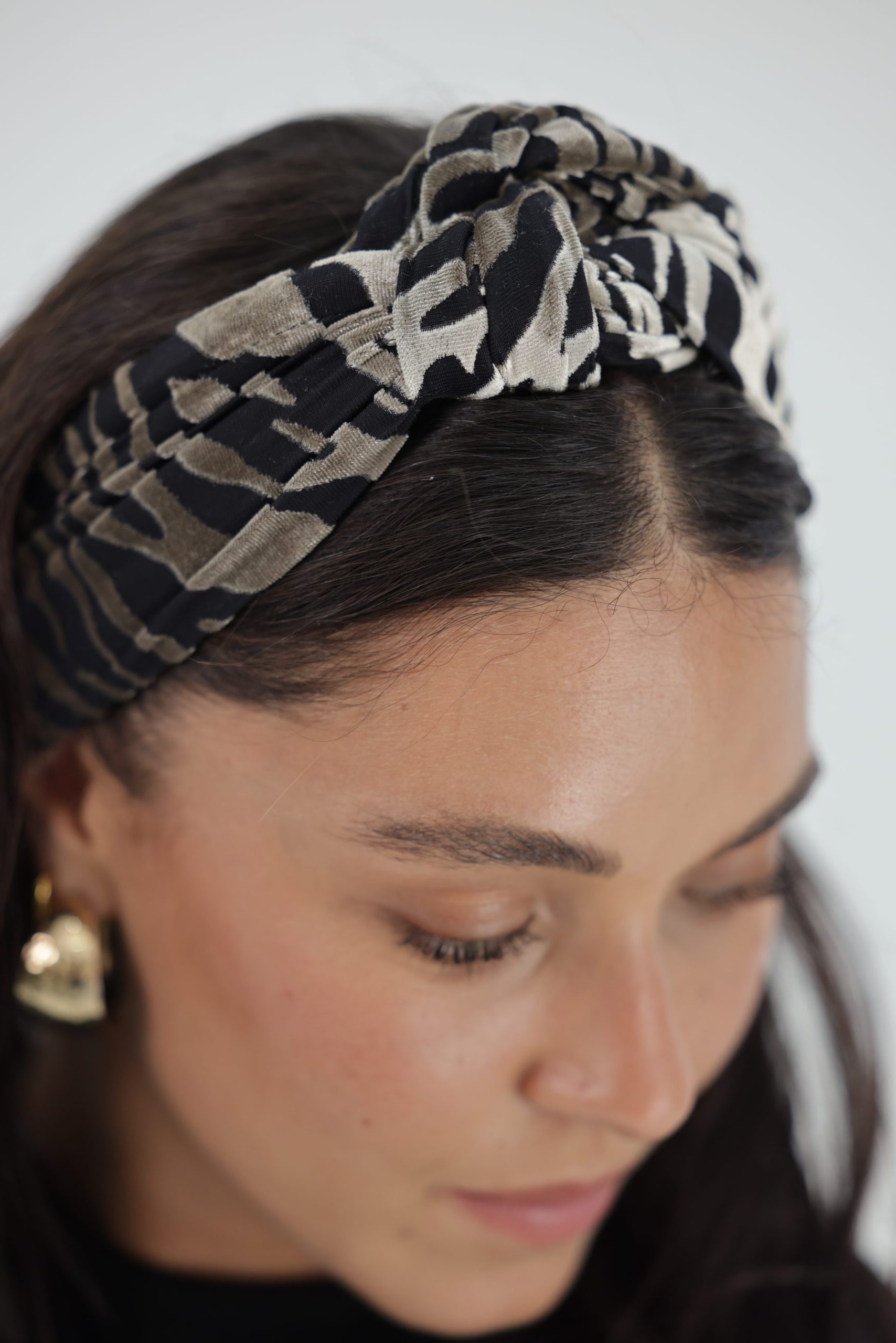 סרט לשיער עם חוט ברזל תפור בפנים ליצירת קשירות מגוונות ופשוטות, מקטיפה צרובה עם בסיס שחור ועליו הדפס מזובר לבן